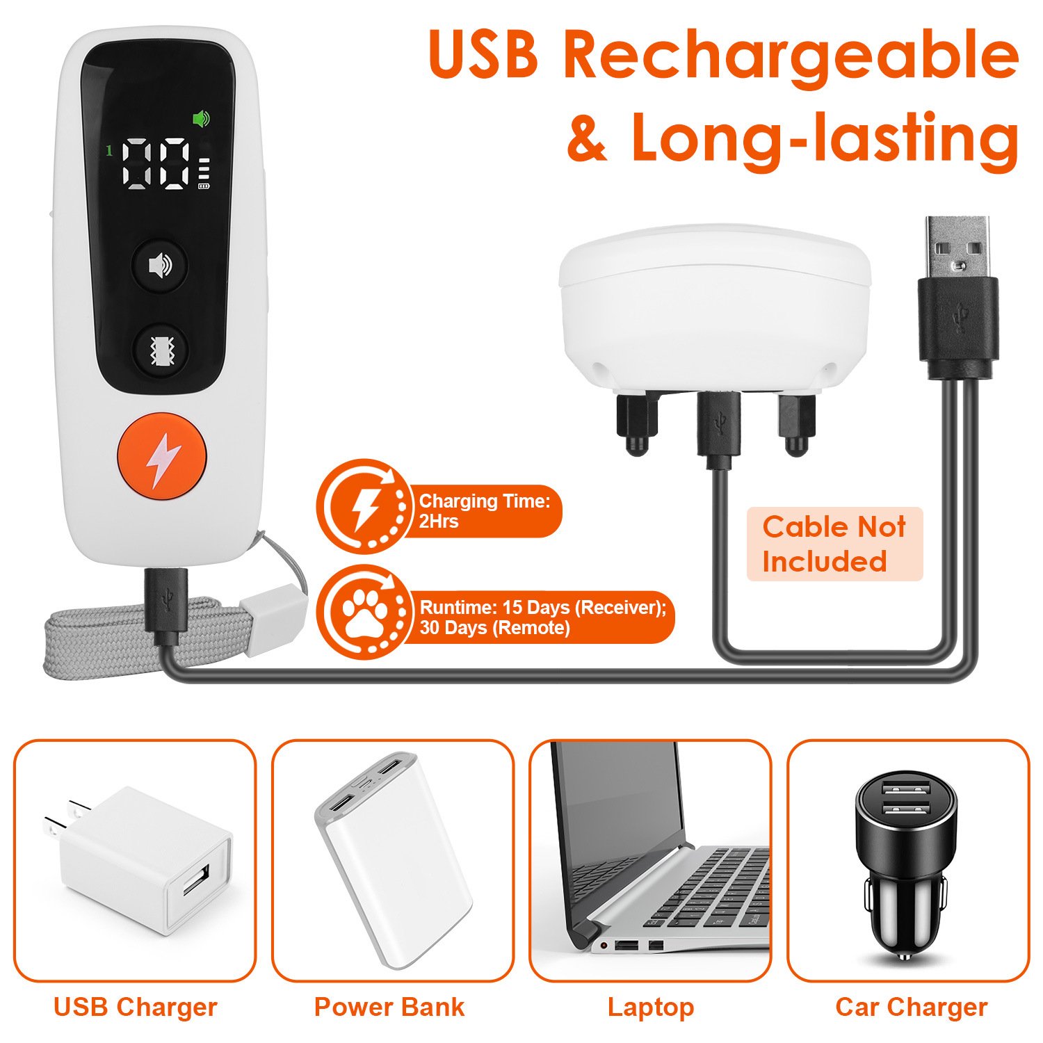 *IP67 Waterproof Receiver*:The IP67 waterproof receiver can work normally when your dog swims or runs in the rain. Make sure that the charging port is well-sealed before the dog runs into water.