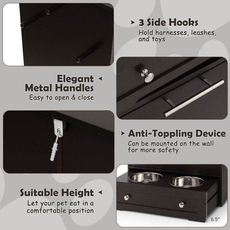 4.Additional Hooks and Stable Structure: The pet storage cabinet comes with 3 hanging hooks on the side, bringing convenience for hanging harnesses, leashes, and toys. Other than that, it is equipped with an anti-toppling device, which can be mounted on the wall for more safety and stability.