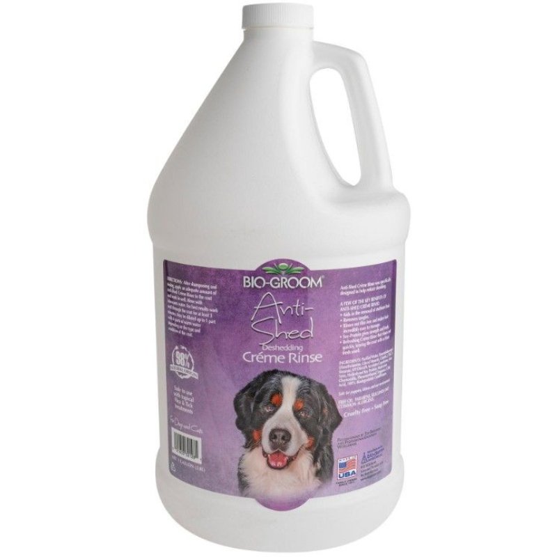 Bio-Groom Anti-Shed Deshedding Dog Cr?me Rinse is a high quality, natural dog conditioner specifically developed to help reduce shedding. This cr?me rinse is great for double coated and long-haired breeds to keep their shedding down. It grips the loose coat and removes stubborn hair and loose undercoat during bathing to cut down on brushing and grooming as a whole. Anti-Shed Cr?me Rinse also removes tangles! This dog shedding conditioner reduces the amount of extra brushing for double coated or long hair breeds. The removal of loose hair decreases the chance of matting and hot spots. Anti-Shed Cr?me Rinse rinses out quickly and film-free, leaving the coat easy to manage and with a clean, fresh smell. It can and should be used all year, but customers will see the greatest benefits during weather changes. This deshedding conditioner for dogs is free of parabens, silicones, and common allergens. It is cruelty free, soap free, and has 100% biodegradable conditioners. Additionally, the Soy Protein formula gives strength and body to the coat. Anti-Shed Cr?me Rinse is safe for puppies, kittens, the environment, and safe to use with topical flea and tick treatments. Recommended by top breeders and professional groomers worldwide.