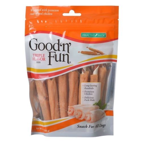 Healthy Hide Good 'n' Fun Triple-Flavor Ribs are crafted with natural rawhide and wrapped in a variety of real meats for a delectable flavor no dog can resist! These gourmet dog chews help reduce tartar buildup and promote better dental hygiene while satisfying your dogs urge to chew.